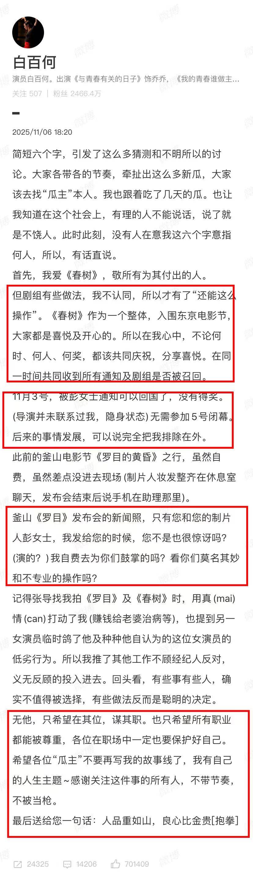 感觉《春树》的导演和制片人根本就不联系白百何,让她自己受气,然后各说各的,爱搭不理,其实制片和导演为了后续合作,应该找白百何方面说清楚事实,没必要写小作文搞拉锯...