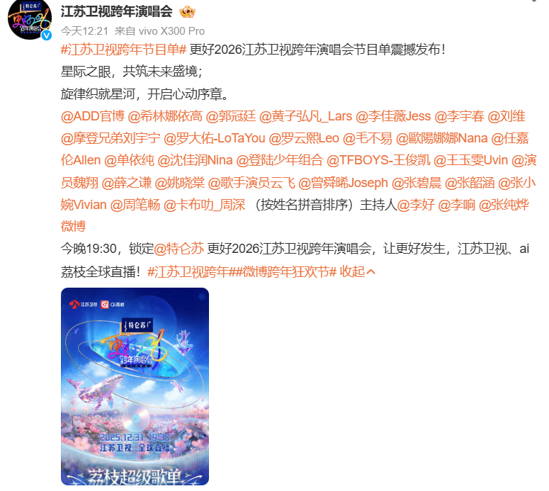 前言 转眼间,又到了年底最让人期待的“跨年大战”。 距离2026年只剩不到一天,央视和各大卫视的跨年晚会名单也陆续官宣完毕。 从顶流偶像到实力唱将,从传统文...