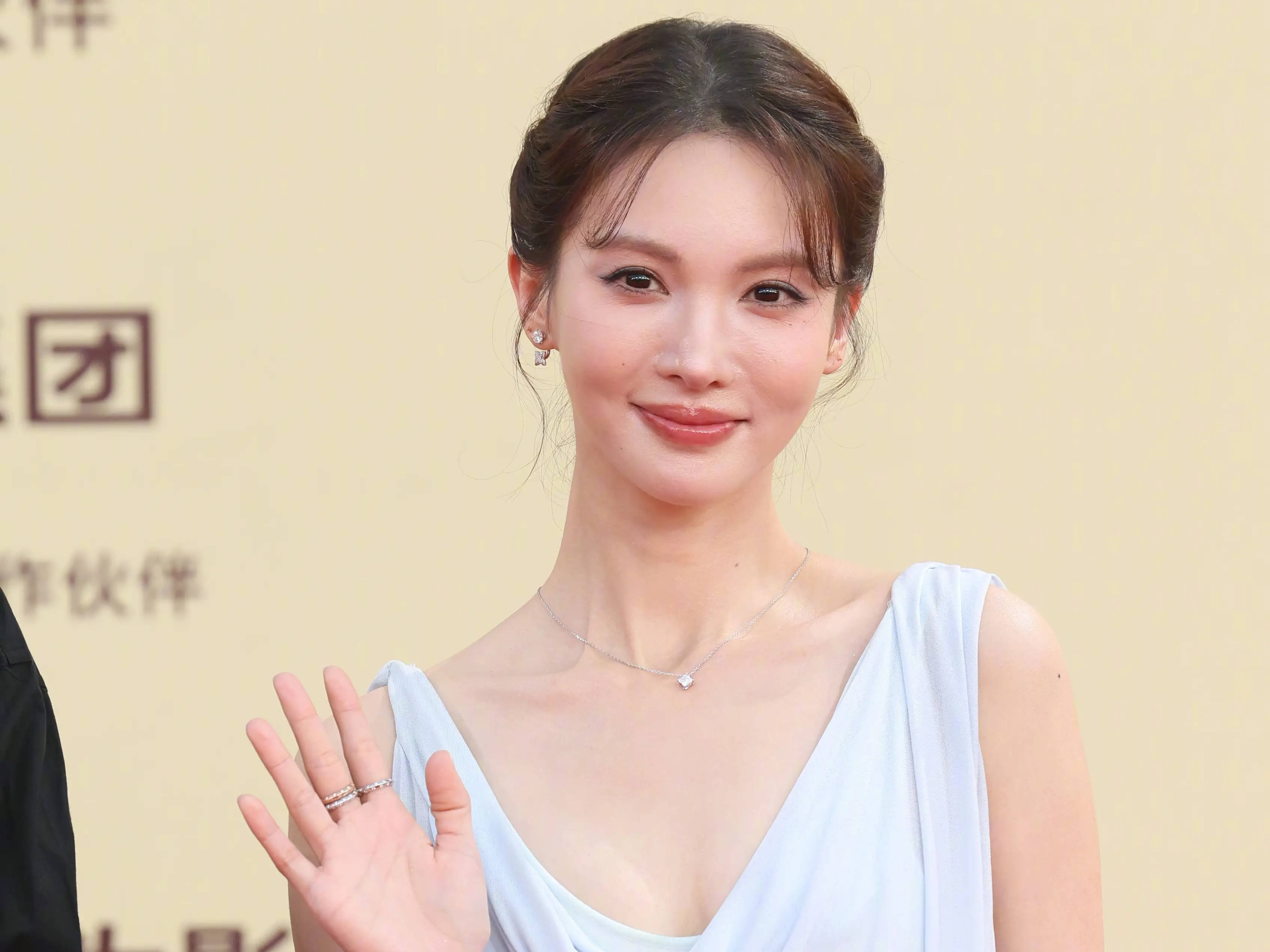金晨淡蓝色深V吊带裙典雅不失性感。