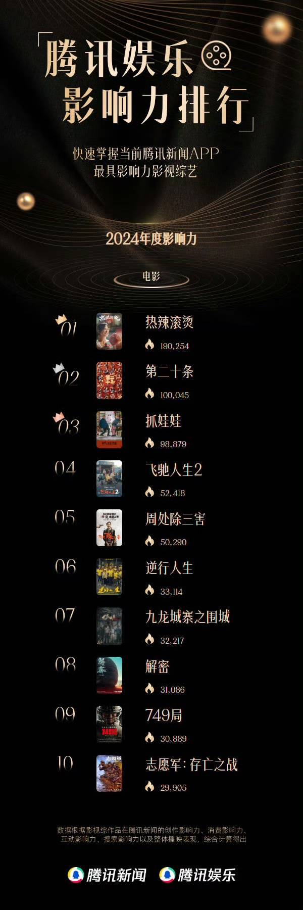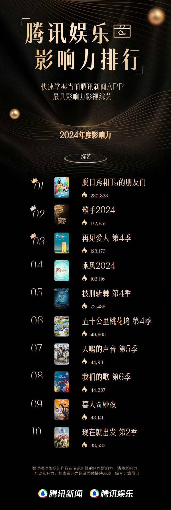 2024年已接近尾声,在这一年的光影世界与综艺舞台中,诸多优秀的作品和令人印象深刻的角色为观众们带来了无尽的欢乐、感动与思考。近日,备受瞩目的#腾讯娱乐2024年度影响力排行#重磅发布,通过对1-11月总体表现的数据统计,为我们梳理出了各个领域极具影响力的代表,让我们一同来看看都有哪些亮点吧。在电视剧领域,荣登榜首的是备受期待且不负众望的《庆余年第二季》。这部剧延续了第一季的精彩故事线,以其宏大的世界观、错综复杂的人物关系以及扣人心弦的剧情,再次牢牢抓住了观众们的心,范闲这一角色更是凭借张若昀的精彩演绎深入人心,在电视剧角色排名中也位列第一,成为了当之无愧的焦点。位居第二的《玫瑰的故事》也凭借独特的叙事风格和刘亦菲对黄亦玫这一角色的细腻诠释,展现出别样的魅力,收获了众多观众的喜爱。而排名第三的《繁花》,在王家卫导演的独特镜头语言下,将老上海的风情与阿宝/宝总(胡歌饰)的传奇故事完美融合,让观众仿佛置身于那个纸醉金迷又充满烟火气的时代,胡歌所塑造的宝总也成功跻身电视剧角色前三甲。电影方面同样佳作频出。夺得魁首的《热辣滚烫》想必给众多观众留下了深刻的印象,它用独特的视角和动人的情节触动着人们内心最柔软的部分。紧随其后的《第二十条》,聚焦现实题材,引发了大众对于诸多社会问题的深度思考,赵丽颖饰演的郝秀萍这一角色也凭借出色的表演在电影角色排名中占据重要位置。而位列第三的《抓娃娃》,虽暂未被大众全面熟知,但能够在众多影片中脱颖而出,也必定有着其独特之处值得观众去挖掘品味。此外,在电影角色排名中,阮经天饰演的陈桂林(《周处除三害》)凭借对角色的精准拿捏,夺得第一名,令人眼前一亮,赵丽颖饰演的乔妍(《乔妍的心事》)同样表现亮眼,位列第三。综艺舞台更是精彩纷呈。排名第一的《脱口秀和Ta的朋友们》以其幽默诙谐又紧贴生活的内容,为观众在繁忙的生活中带来了一次次开怀大笑的时刻,成为大家休闲娱乐时的优选。《歌手2024》则延续了系列节目的高水准,各路实力唱将汇聚一堂,用美妙的歌声为观众打造了一场又一场的听觉盛宴,收获了极高的人气。《再见爱人 第4季》则聚焦情感关系,通过真实呈现嘉宾们的情感故事,引发大众对于爱情、婚姻等亲密关系的深入探讨,在综艺市场中独树一帜。这些作品和角色之所以能够在腾讯娱乐影响力排行中脱颖而出,一方面得益于创作者们的匠心独运,无论是编剧精心打磨的故事、导演别具一格的呈现手法,还是演员们精湛投入的表演,都为作品的成功奠定了坚实基础;另一方面也反映出当下观众对于优质影视综艺内容的高度认可与积极追捧。随着2024年即将画上句号,这些名列前茅的作品和角色已然成为这一年娱乐行业的璀璨印记,它们承载着创作者们的心血以及观众们的热爱,也为未来的影视综艺创作提供了宝贵的借鉴和启示,期待未来能有更多精彩的作品涌现,继续在光影与舞台间为我们编织绚丽多彩的梦。