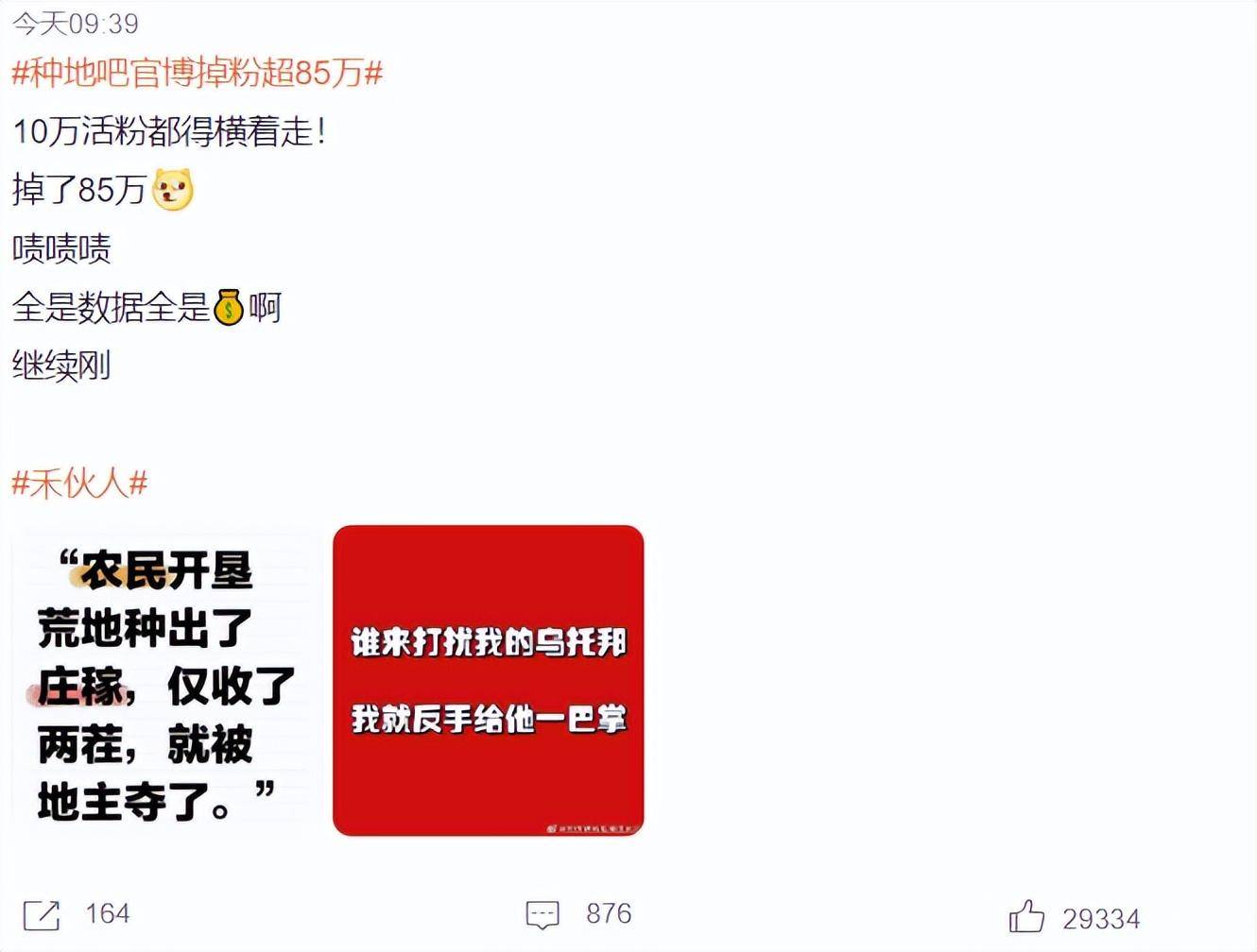 这样的情况出现后,《种地吧》忠实的粉丝纷纷发声,并直接取关《种地吧》,随着事情越演越烈,我们可以看到,《种地吧》已经掉粉85万,看到这样的情况,网友们察觉到事情有些不对,因为内娱的当红流量小生,都不一定有这么多忠实的活粉。