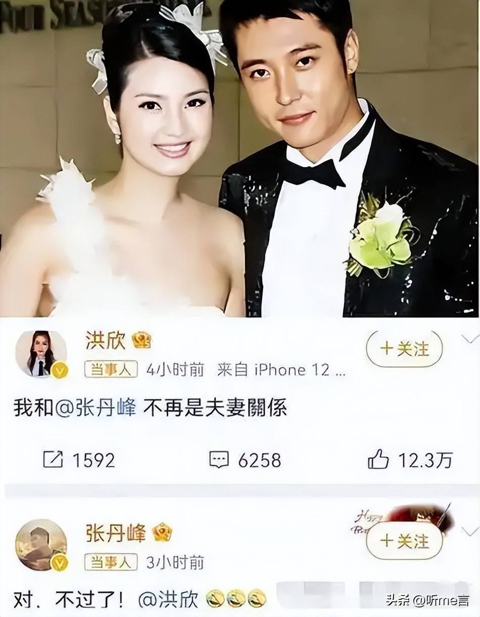 2023年5月1日,洪欣直接在微博上连发三条宣布离婚,随后张丹峰也果断回复表示:不过了。