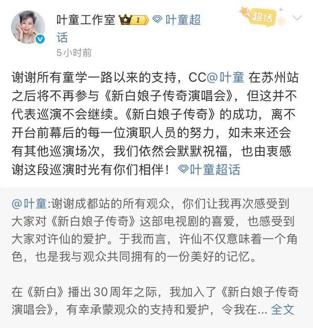 叶童工作室随后转发并称:谢谢所有童学一路以来的支持,叶童在苏州站之后将不再参与《新白娘子传奇演唱会》,但这并不代表巡演不会继续。《新白娘子传奇》的成功,离不开台前幕后的每一位演职人员的努力,如未来还会有其他巡演场次,我们依然会默默祝福,也由衷感谢这段巡演时光有你们相伴!