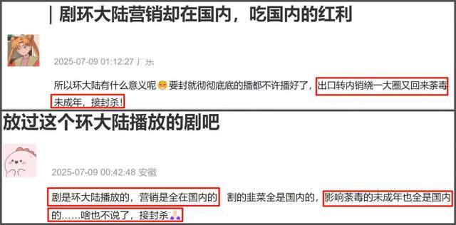 况且田栩宁的双男主剧为什么环大陆自己心里没数吗?出口转内销还在网友雷区蹦迪。环大陆剧在内地营销,各种片段到处传播,又正值暑假档,受荼毒的还有未成年,男主又各种黑料齐飞,这种影响非常恶劣。