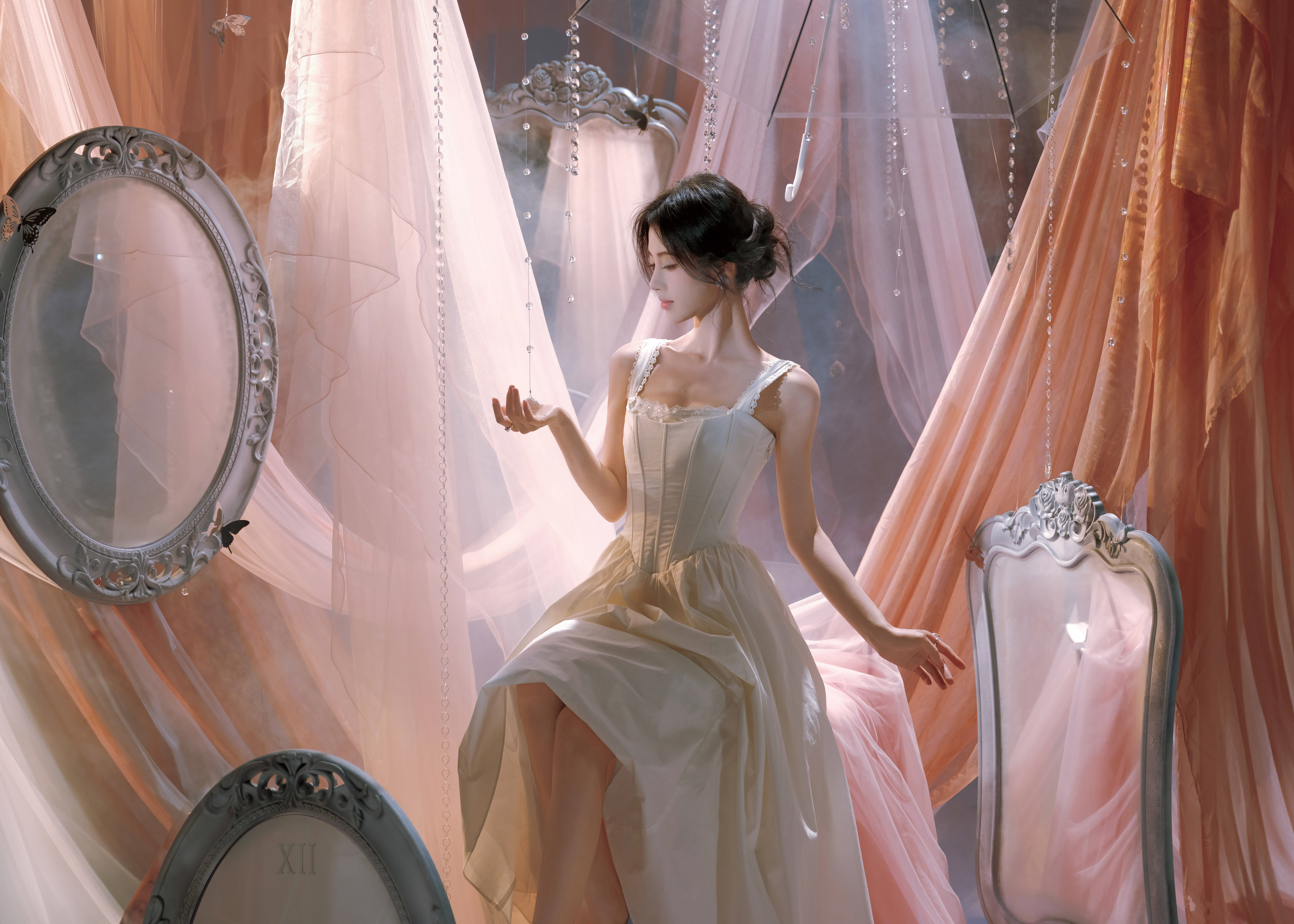 鞠婧祎与镜子合照,好似进入仙境的爱丽丝。
