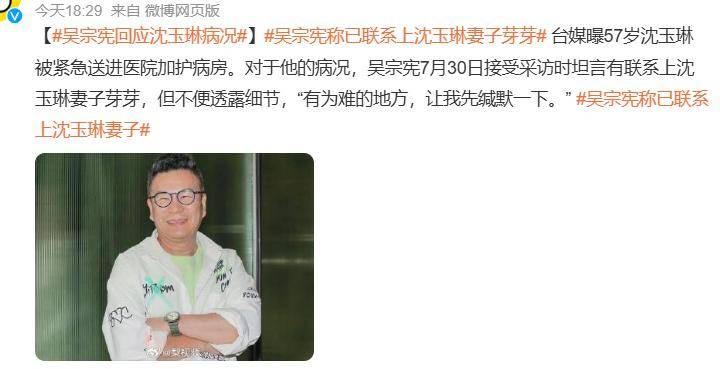 一时间各方传言纷纷,好友吴宗宪则表示,自己已经联系上了沈玉琳的妻子,但不好透露他的病情。