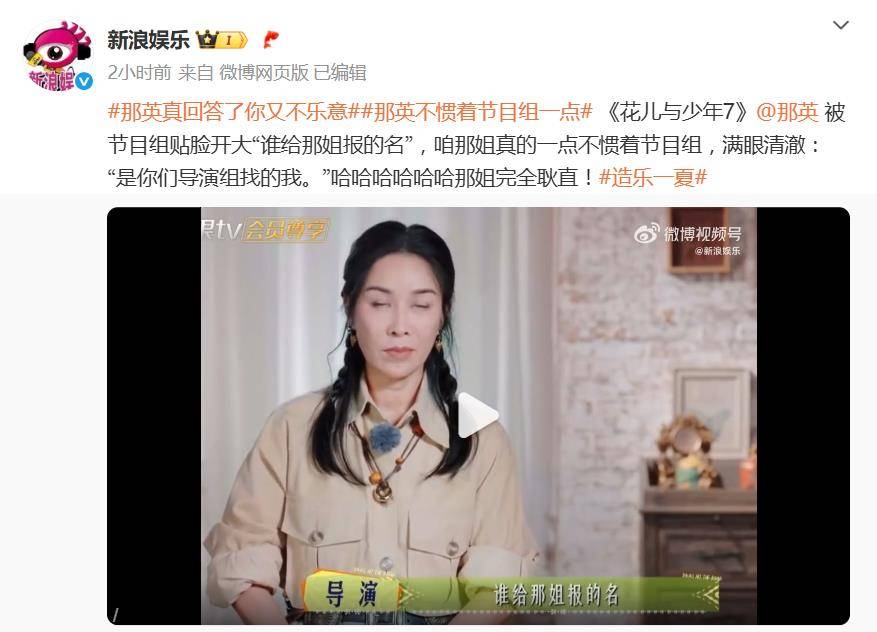 在节目中,制作组早已醞釀了一段“温情”的剧情,循规蹈矩地抛出两个老套的问题:“这次您为什么选择参加《花儿与少年》?”面对这个问题,那英显得相当从容,直言不讳地表示:“音乐类节目录到头了,想尝试一些新的东西。”接着又问“这次是谁给您报的名呀?”试图诱导她给出粉丝期待的回答,结果她又一语道破:“是你们导演组找的我啊!”配合一脸的不解与无奈,节目组当场哑口无言。