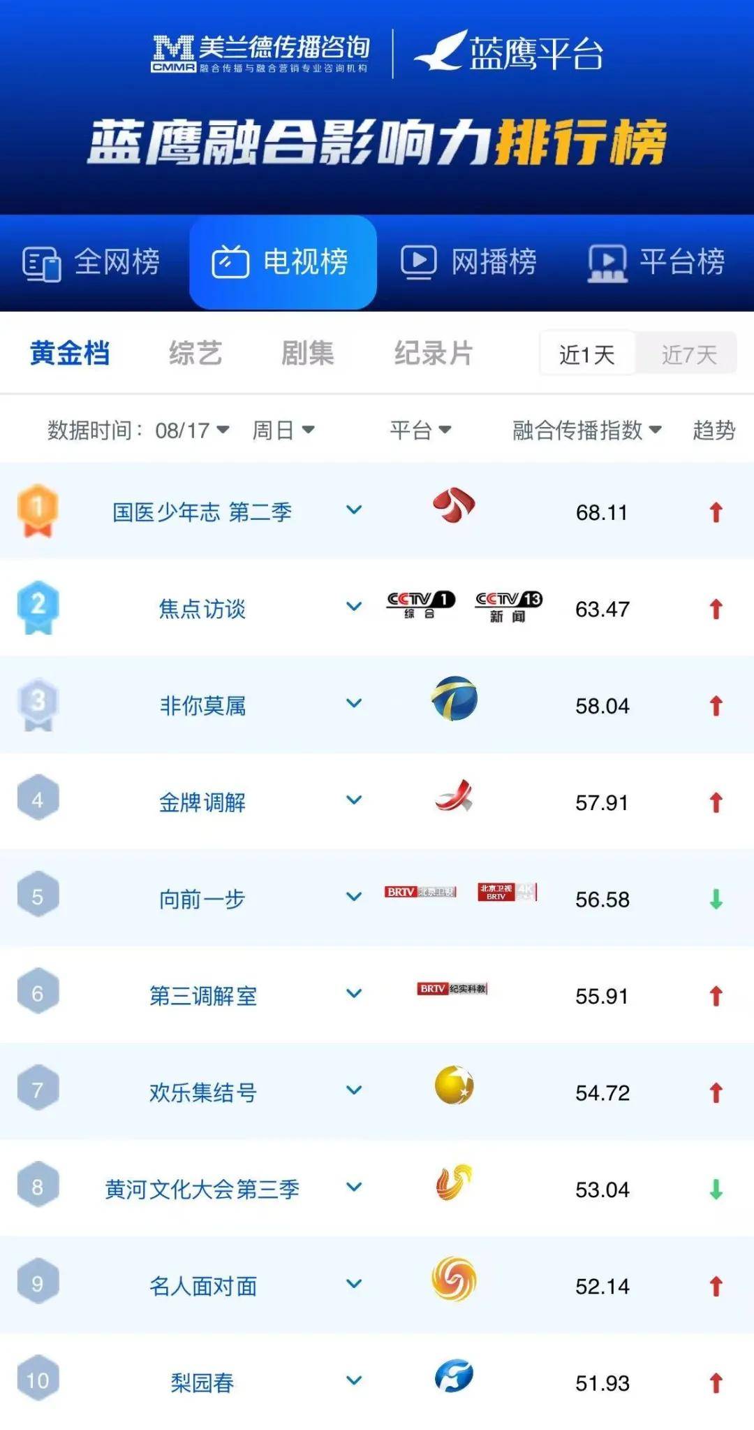江西卫视《金牌调解》昨日更新,节目以全国首创的“电视+人民调解”模式呈现真实矛盾化解现场,推出“户外调解”和“角色互换”等环节,真实氛围吸引网友二次转发分享;“冤家母女”等节目片段在播放量飙升,延展出“幸福课堂”等衍生线上内容,在短视频平台高热传播。节目昨日位列晚间黄金档电视节目融合传播指数榜第四。