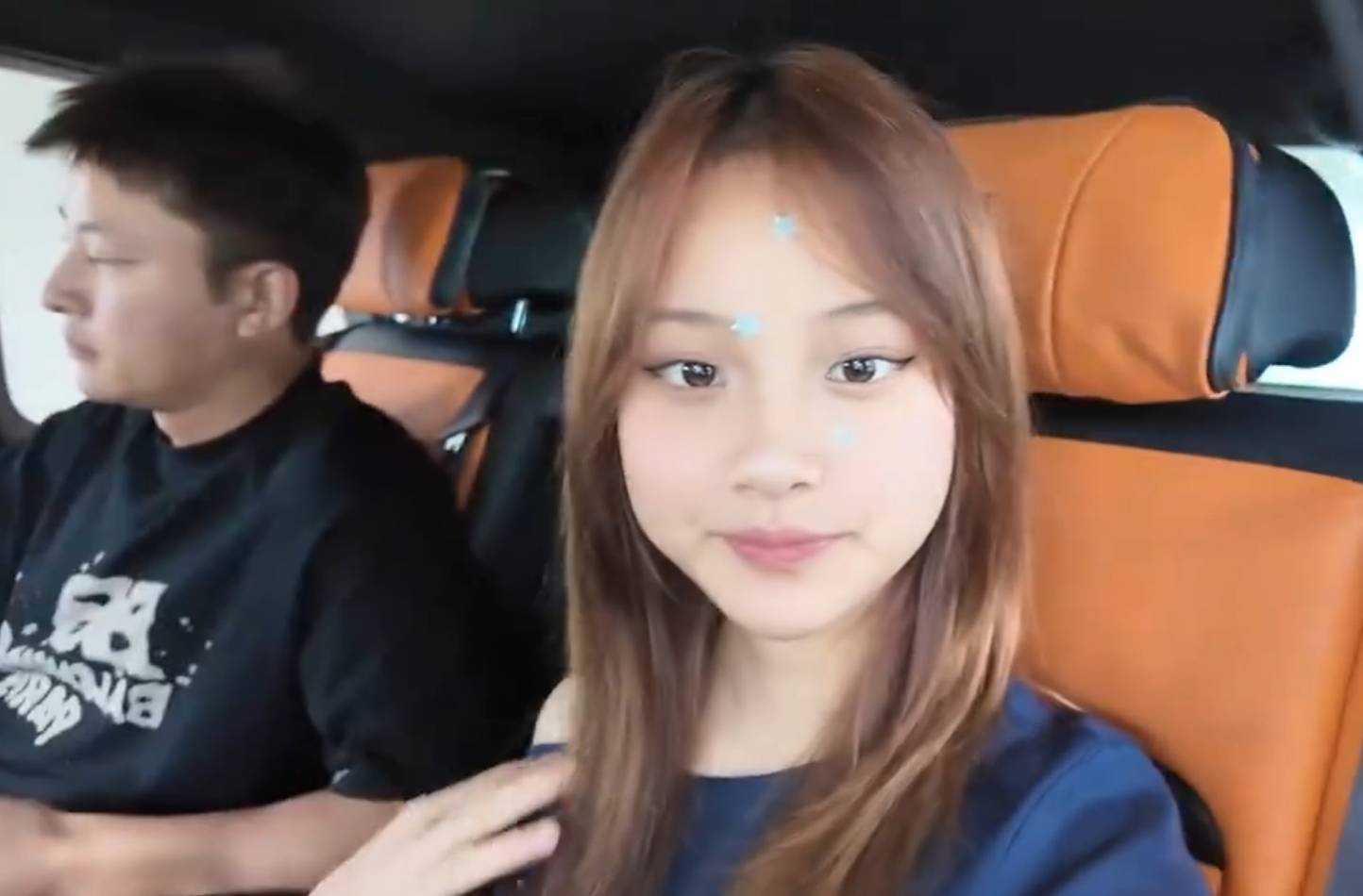 甜馨与爸爸贾乃亮在车上合影。