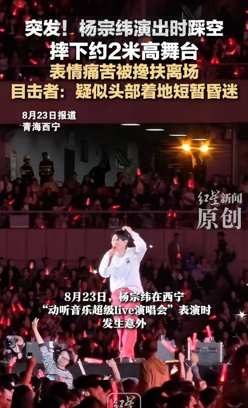 热搜“#杨宗纬报平安#”背后,是一场惊心动魄的舞台意外。2025年8月23日晚,青海西宁动听音乐超级LIVE演唱会上,正当杨宗纬唱完《越过山丘》那句“就让我随你去”的瞬间,因舞台机械突然后退,他从两米高台侧身坠落,头部疑似着地并短暂昏迷,现场观众惊呼一片。