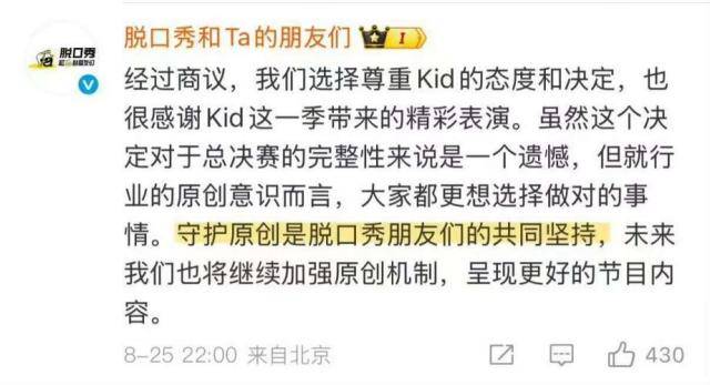 Kid发布声明后,节目官博第一时间转发,既表达“尊重决定”的态度,更强调“守护原创是行业共同坚持”,并迅速承诺“加强原创机制”。
