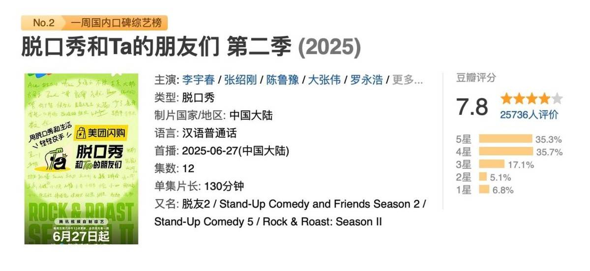 当《脱口秀和Ta的朋友们》第二季(简称《脱友2》)的最后一束灯光熄灭,这个夏天最耀眼的语言艺术盛宴正式落下帷幕。这档现象级综艺以豆瓣7.8分、腾讯视频站内22000 热度及9.1分的惊人数据,刷新了年度脱口秀类节目的品质标杆。社交媒体上12亿次的讨论量,以及跨节目艺人争相引用的\"出梗\"现象,无不彰显其破圈影响力。