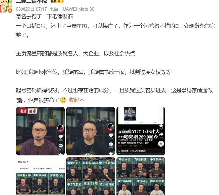 他不是什么专业的财经专家,销售行业出道当主播,碰瓷过好几个当红企业家,包括雷军,虞书欣并不是他唯一针对的博主。