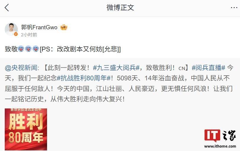 IT之家注意到,《流浪地球》系列导演郭帆今日发布了自己九三阅兵的“观后感”,表示“改改剧本又何妨。”