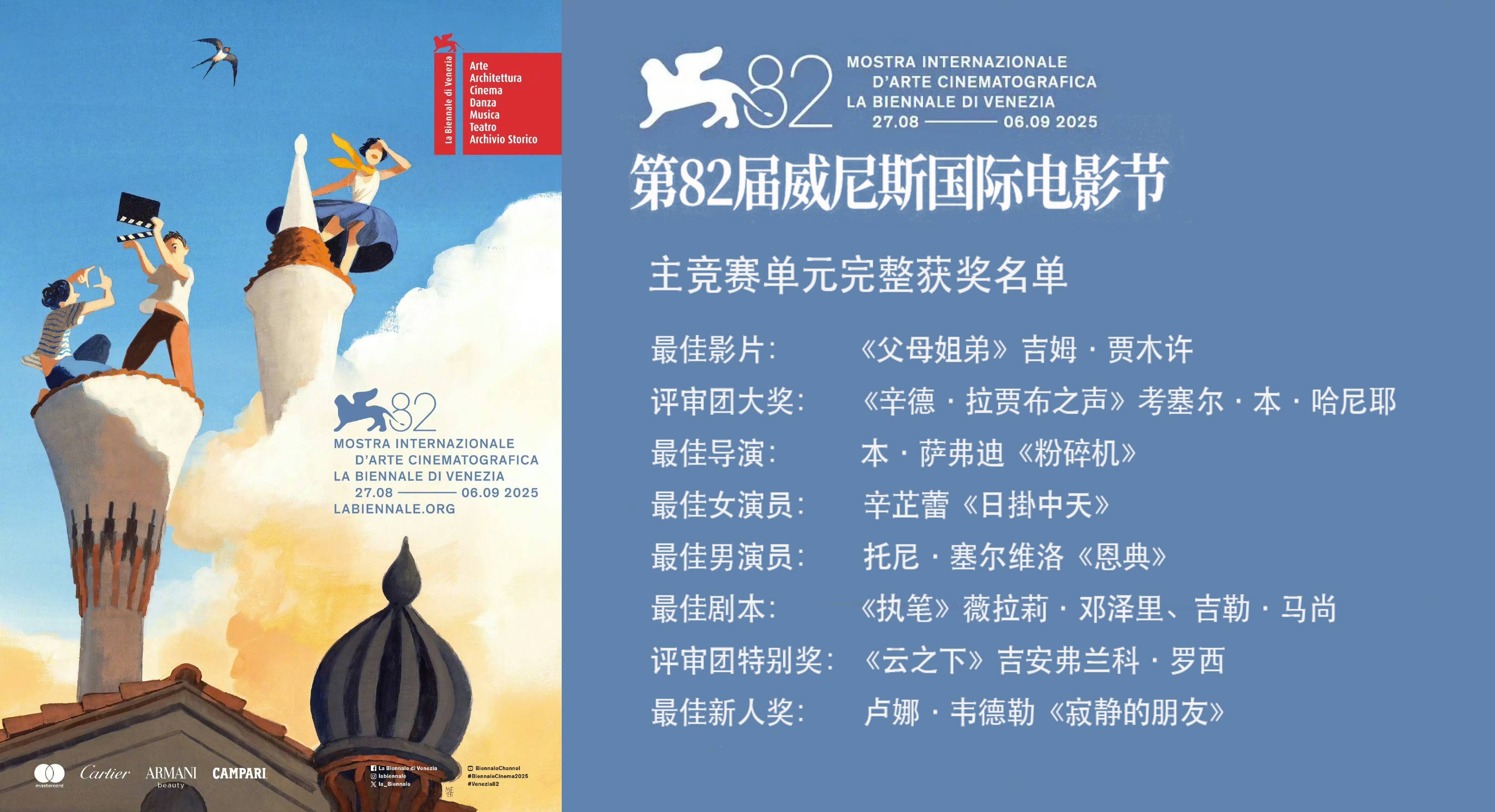 搜狐娱乐讯 2025年第82届威尼斯电影节获奖名单北京时间9月7日凌晨颁出:吉姆·贾木许执导、凯特·布兰切特等主演电影《父母姐弟》夺最佳影片金狮奖;辛芷蕾凭借电影《日掛中天》荣膺最佳女演员,成为继巩俐(1992年《秋菊打官司》)和叶德娴(2011《桃姐》)后,第三位获得该奖项的中国女演员,第二位获得该奖项的中国内地女演员。