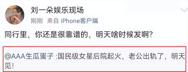 娱记AAA生瓜蛋子爆料说,“娱乐圈有国民级女星后院起火,老公出轨了,明天见!”