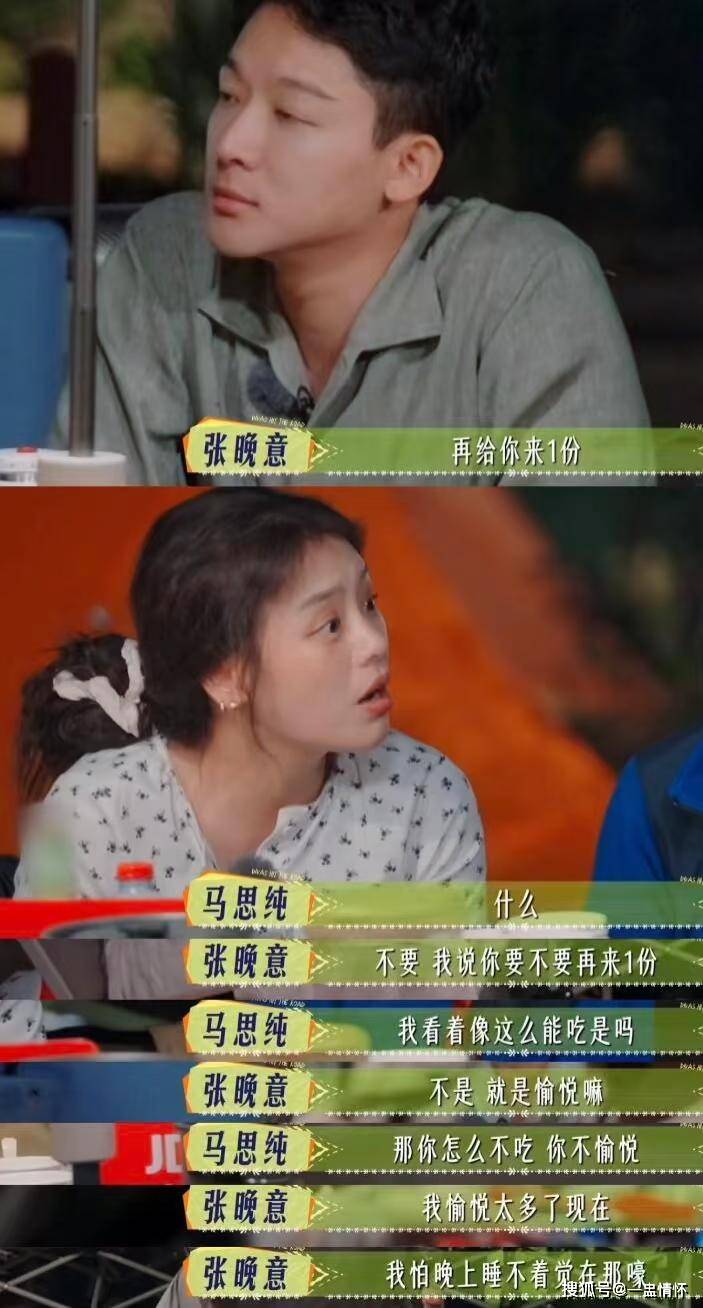 吃饭的时候也是努力的想给马思纯多来一份,马思纯质问自己看起来胃口这么大吗?他狡辩:“不是,就是愉悦嘛。”被要求自己多吃点,张晚意:“我怕晚上睡不着在那嚎。”晚上吹头发,因为有了毛巾就拒绝吹风机,给马思纯拍照可以拍一百张,但是技术还停留在上个世纪。
