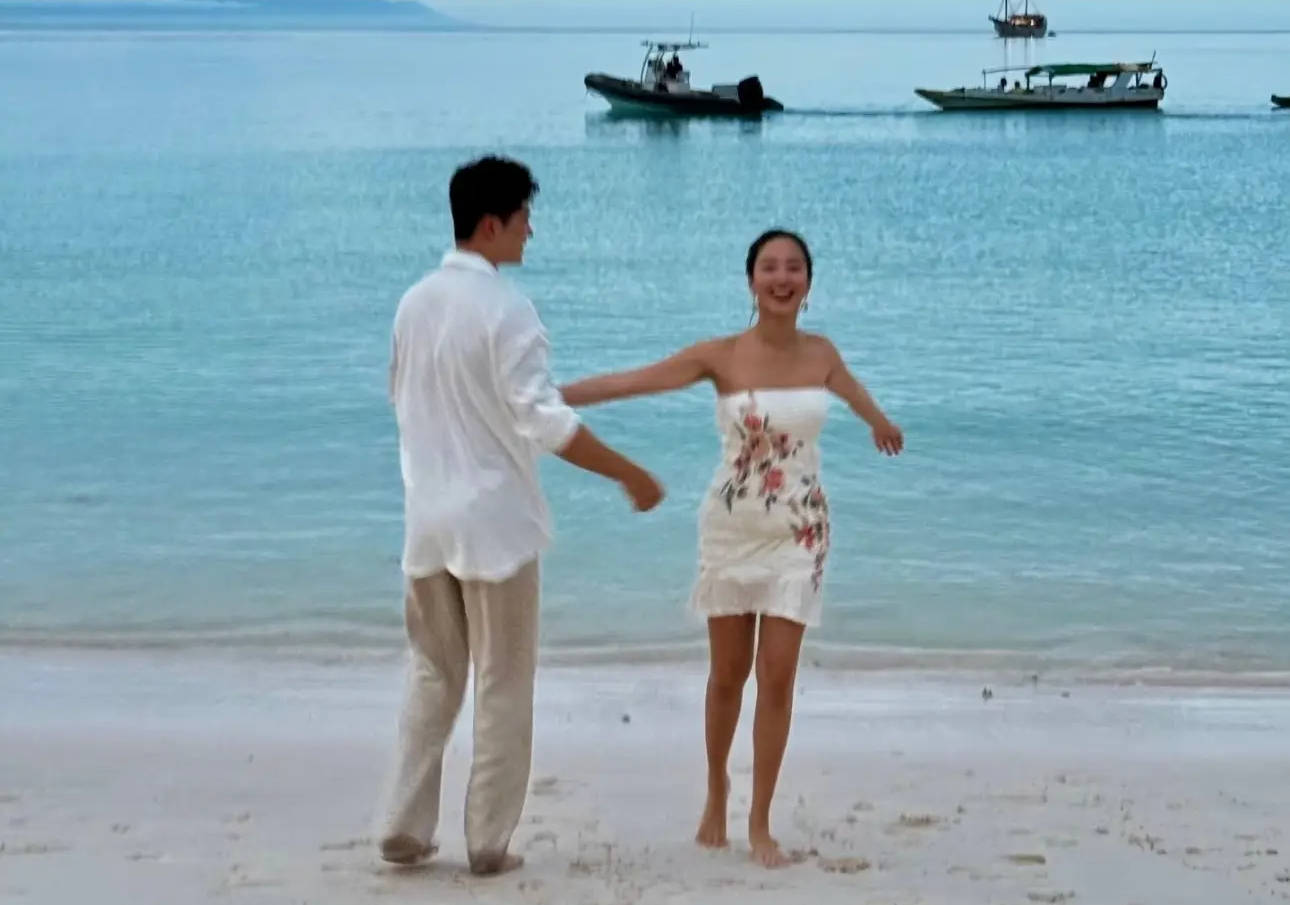 杨采钰穿着白色抹胸裙和老公在沙滩玩耍。