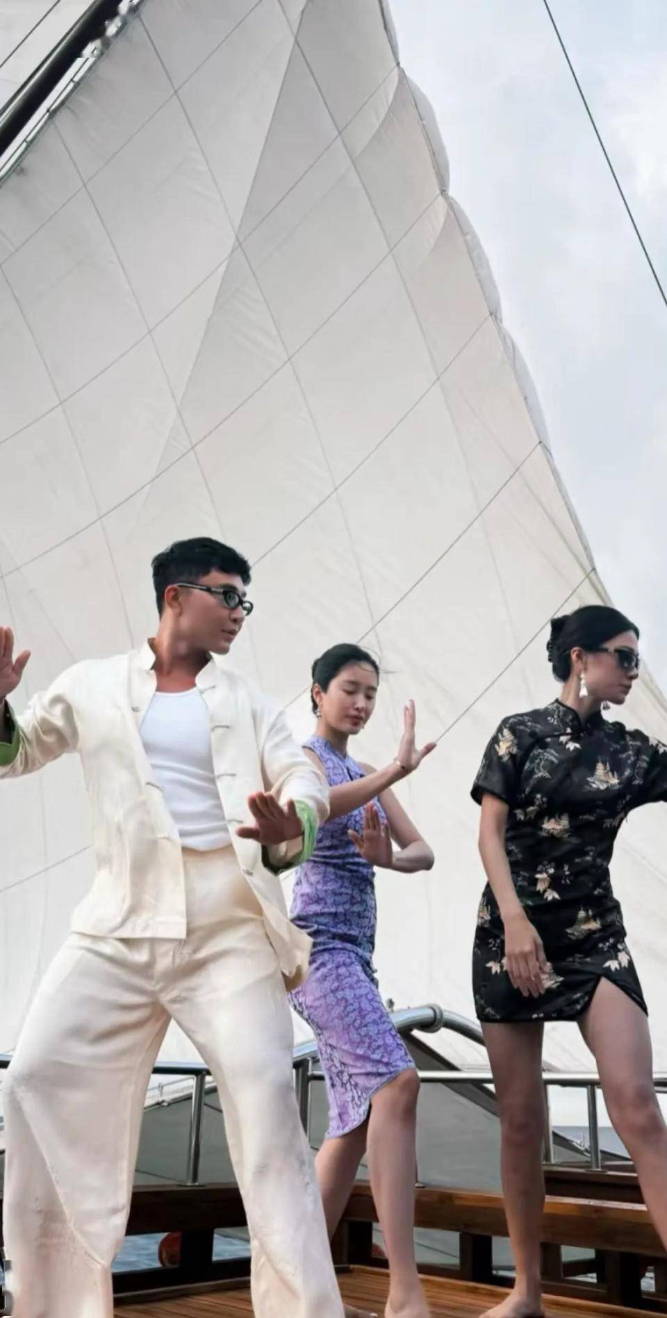 享受有老公陪伴的杨采钰还在游艇上拍了一张单人照,照片中,杨采钰迎着风翩翩起舞,瞬间梦回《芳华》,当妈后也依旧好美呀!