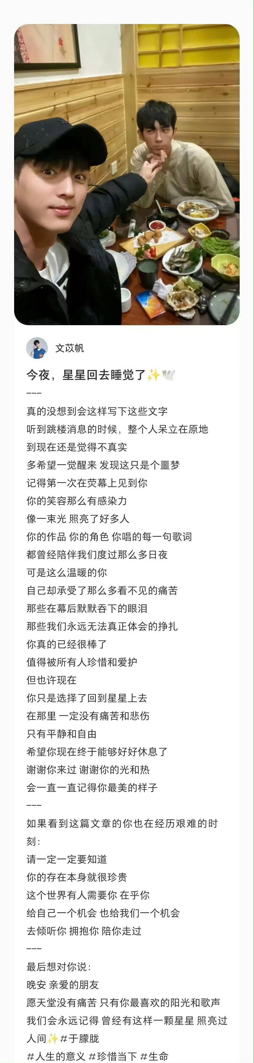文苡帆的这段文字就是悼念于朦胧的,其实他可能也不知道真相,所以发出来就删掉了。但他提到可是这么温暖的你,自己却承受了那么多看不见的痛苦,那些幕后默默吞下的眼泪,那些我们永远无法真正体会的挣扎。