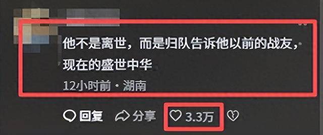 但也有天性乐观的网友表示,老人不是离世,而是归队,是与自己的战友相聚,告诉他们现在的盛世中华。