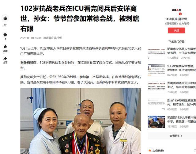 潇湘晨报,102岁抗战老兵在ICU看完阅兵后安详离世,孙女:爷爷曾参加常德会战,被刺瞎右眼