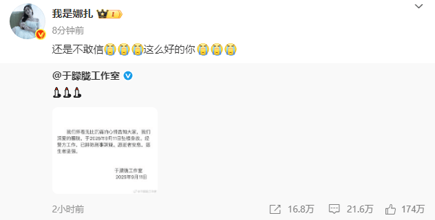 烧饼发文悼念于朦胧:“我到现在都不敢相信这一切是真的,一直回忆你送我的衣服,咱们在酒店吃火锅聊天!学舞蹈的时候我们互相加油,一起流汗一起熬夜,愿你往生极乐!一路好走,朋友!真的是人生无常,啊啊啊啊啊啊!心里难受。”