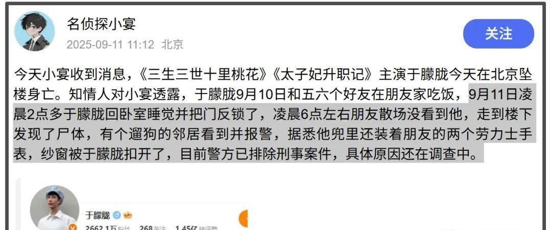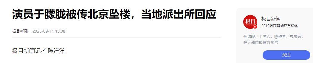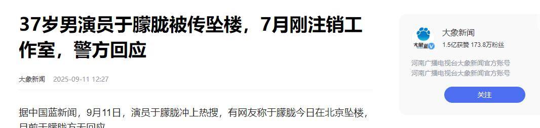 37岁男演员于朦胧被传坠楼,7月刚注销工作室,警方回应 -大象新闻
