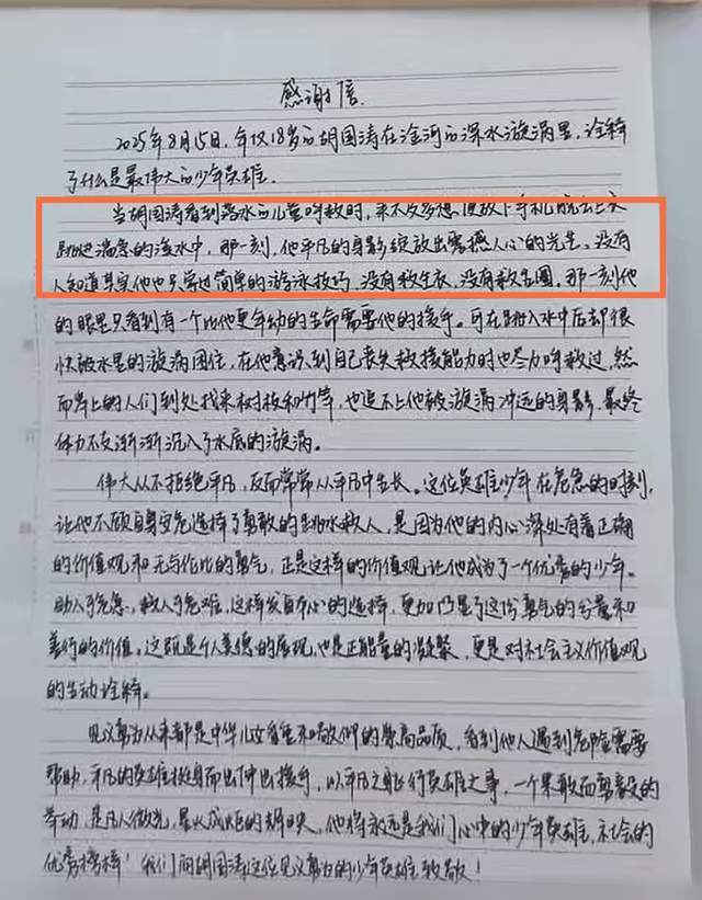 事后,被救者家人送来一面锦旗,以及一封感谢信,但对于胡国涛的妈妈来说,她宁愿不要这些东西。