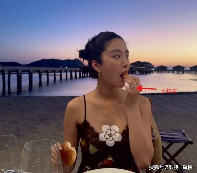 有一张照片是,杨采钰坐在椅子上吃水果,手上的戒指很抢眼。