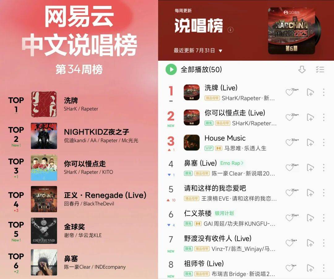 甚至随着节目播出,不少观众的歌单也在频频更新,带动不少歌曲在各大音乐平台屠榜:Wings一首《卓巴卓巴》深入人心,不仅斩获QQ音乐飙升榜冠军,还在网易云音乐拿下热力值破150万的好成绩;SHarK与Rapeter吴嘉轩合作的《洗牌》更是成为各平台的大热单曲,在网易云音乐收藏破150万,相关的二创视频也拿到百万级点赞……《鼻塞》《杨过》等也都在节目播出后成为传播度颇高的热门单曲。