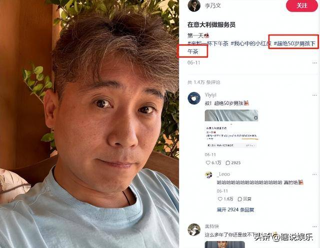 看到乃文叔在社交平台上分享照片会带上一些奇怪的话题“超绝50岁男孩下午茶”。