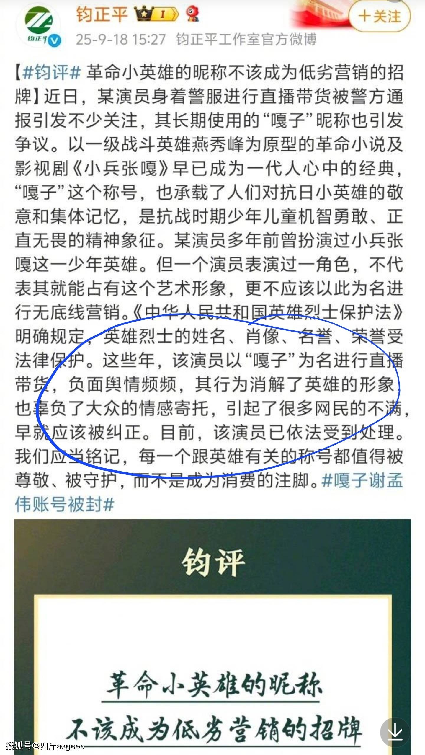 直接说革命英雄的昵称不应该成为逐利赢家的招牌,点名谢孟伟占用这个艺术形象进行无底线营销,并且,呼吁禁止谢孟伟以嘎子名义进行直播带货,引发负面舆论等等。