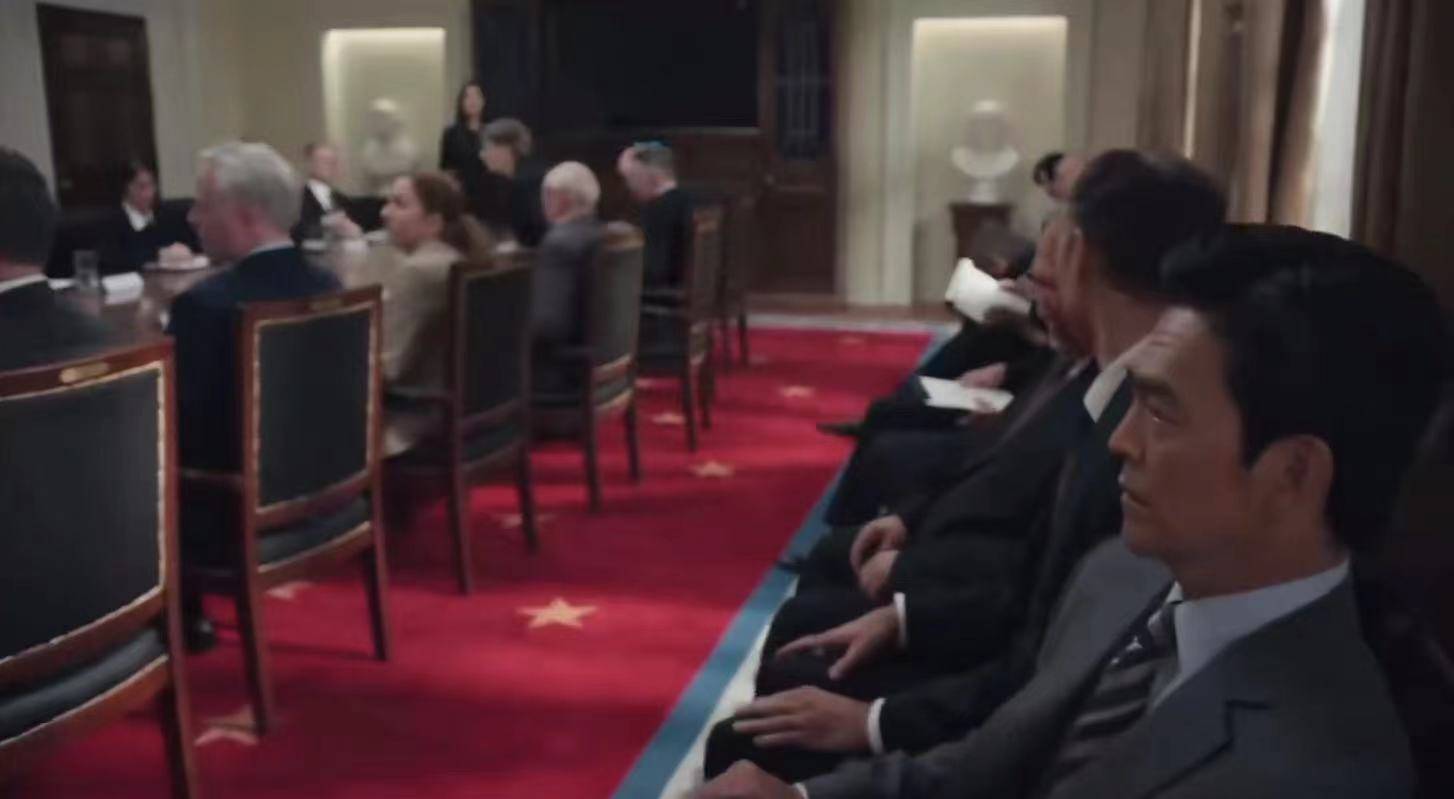 这个镜头表现的是美方高管在开会,看看他们的地毯颜色,是中国五星红旗,他们这是践踏我们的尊严,士可杀不可辱,真的欺人太甚。