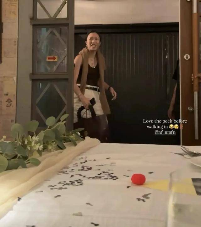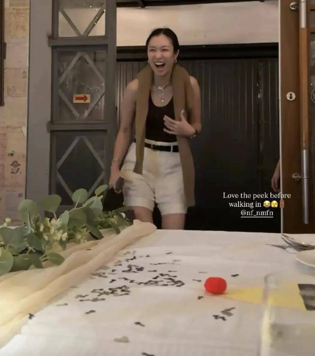 派对现场,十几个朋友,她们提前准备好,布置好现场,准备好了鲜花气球,蛋糕还有红酒,Namfon盛装出席,笑得开心,之后一起发合影庆祝。