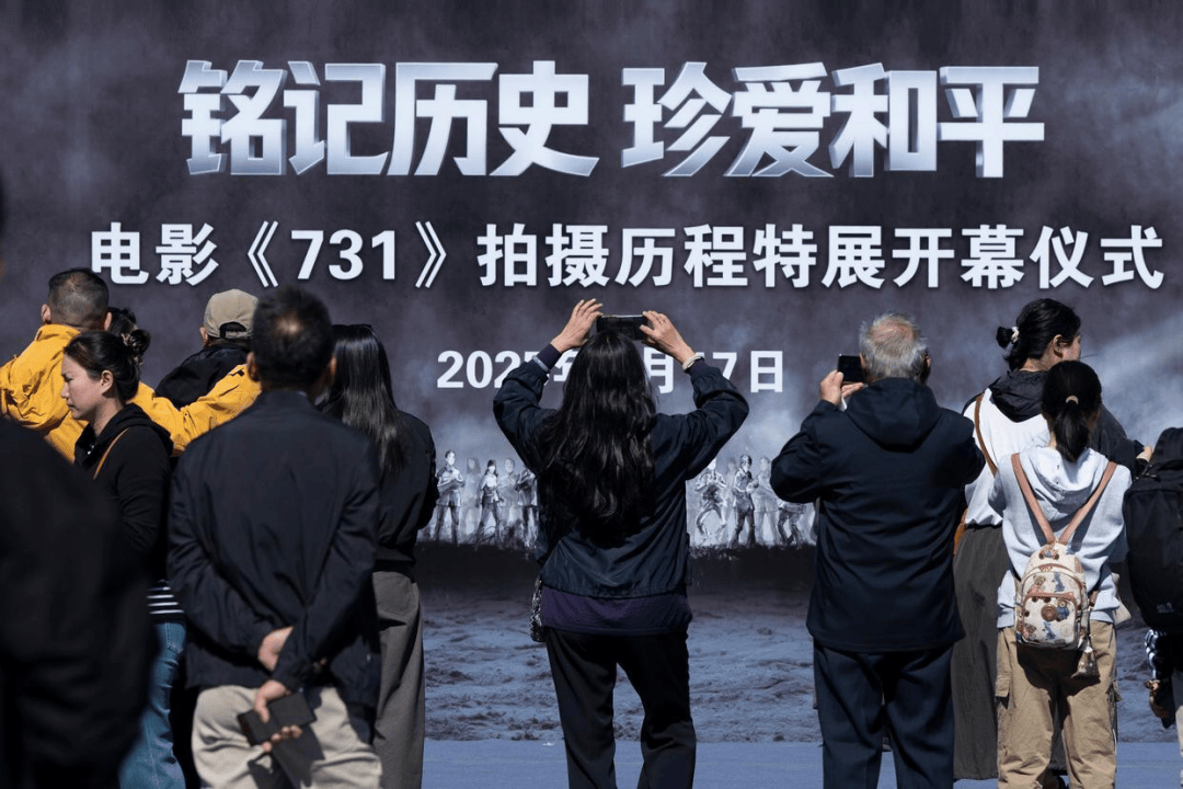 9月17日,参观者在电影《731》拍摄历程特展开幕仪式上拍照 图:新华社