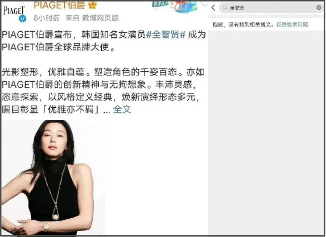 全智贤的代言在中国铺设不少宣传,辱华风波发酵之后,品牌陆续下线了全智贤的广告,但这还不够,随后包括伯爵、海蓝之谜、LV等大牌代言全都删除全智贤有关宣传博文。