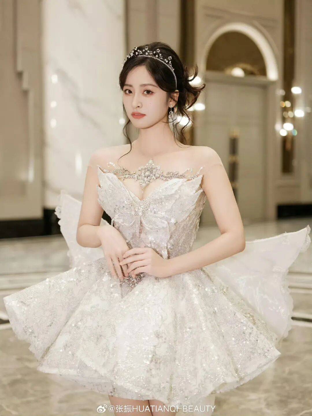 沈月身穿一袭白色抹胸连衣裙,她戴着钻石发箍和精致小耳环,特意露出自己傲人的事业线和白皙的香肩,她单手托着俏脸的样子,绝对性感撩人!