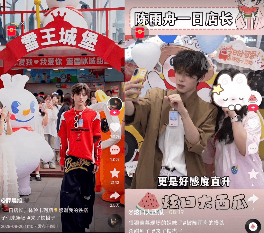 快手还摇来了明星达人@薛晨旭(快手粉丝160.5万)、@陈雨舟(快手粉丝205.3万)空降蜜雪冰城门店担任“一日店长”,打破次元壁,现场宠粉强势引流。