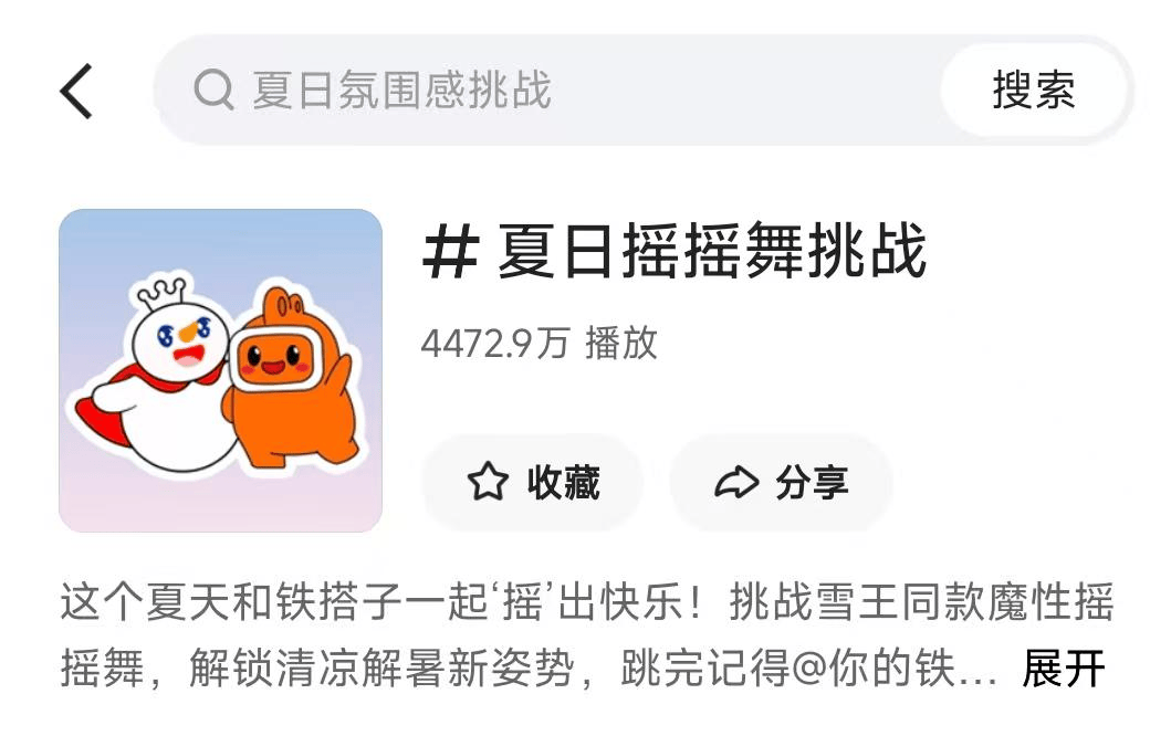 首先是玩法上的创新,快手搬出了在老铁中深受欢迎的舞蹈挑战,以及雪王的萌感形象的“摇摇舞”,在顶流IP雪王的牵头热舞下,引发用户模仿和创作。快手站内#夏日瑶瑶舞挑战的相关播放量达到了4472.9万。