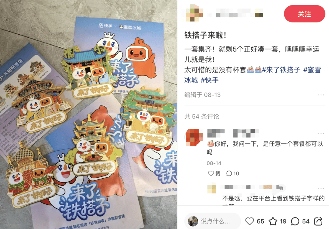 以消费者最为关心的联名周边设计为例,快手和蜜雪冰城放入了诸多巧思,将地域性建筑融入到冰箱贴产品中。