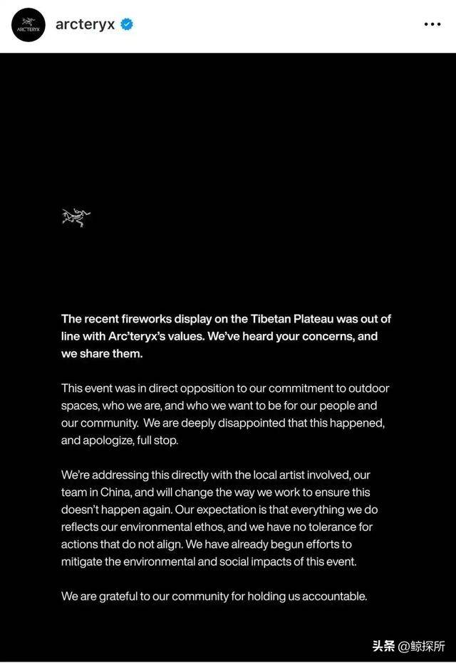 在海外版道歉信上,他们写的是对青藏高原烟花表演身高遗憾,这个行为和品牌环保价值观以及期望不符,可却在后面提到了正在和相关艺术家以及中国团队进行沟通,调整工作方式。