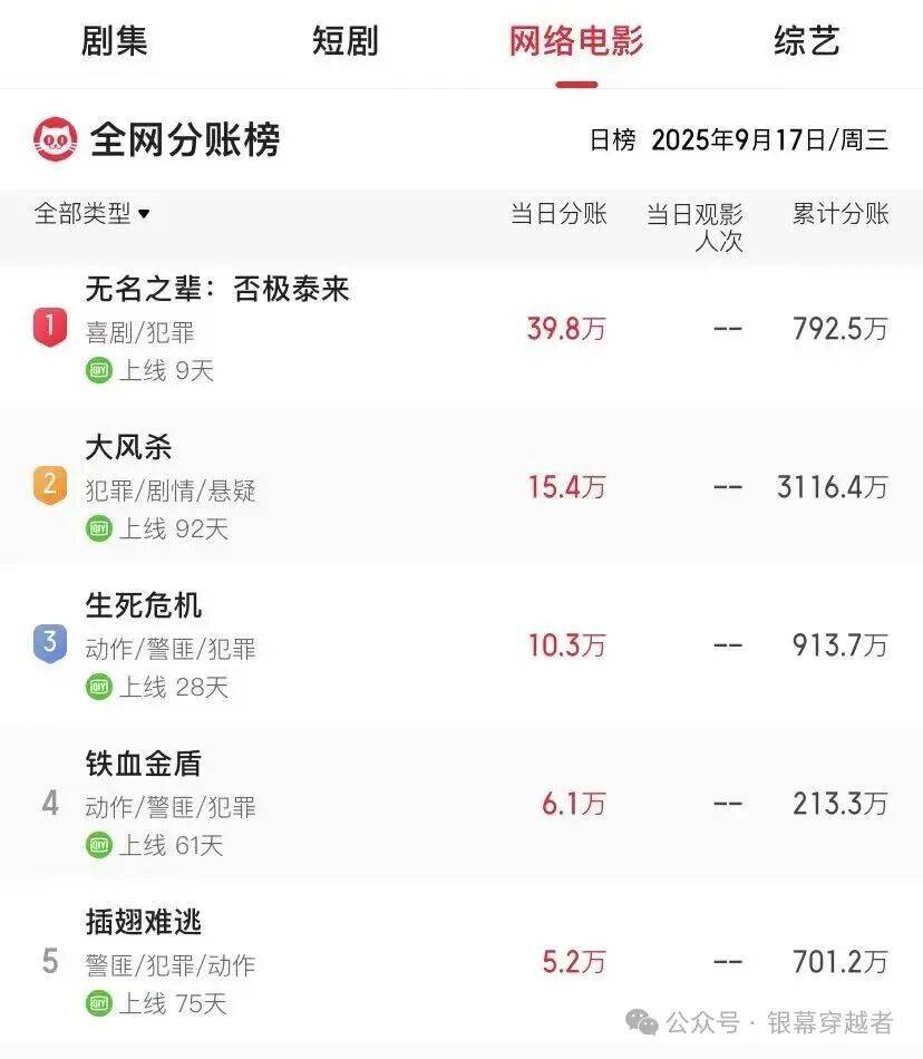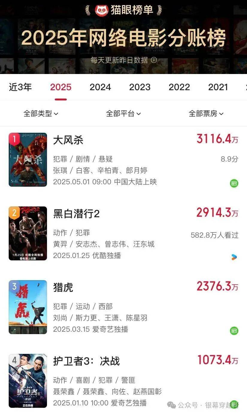 《无名之辈2》并不是第一部受益的院线电影,今年以来,网端分账收益破千万的电影中,位列TOP1的《大风杀》、也是唯一一部分账超3000万的影片,该片就是一部院线电影。