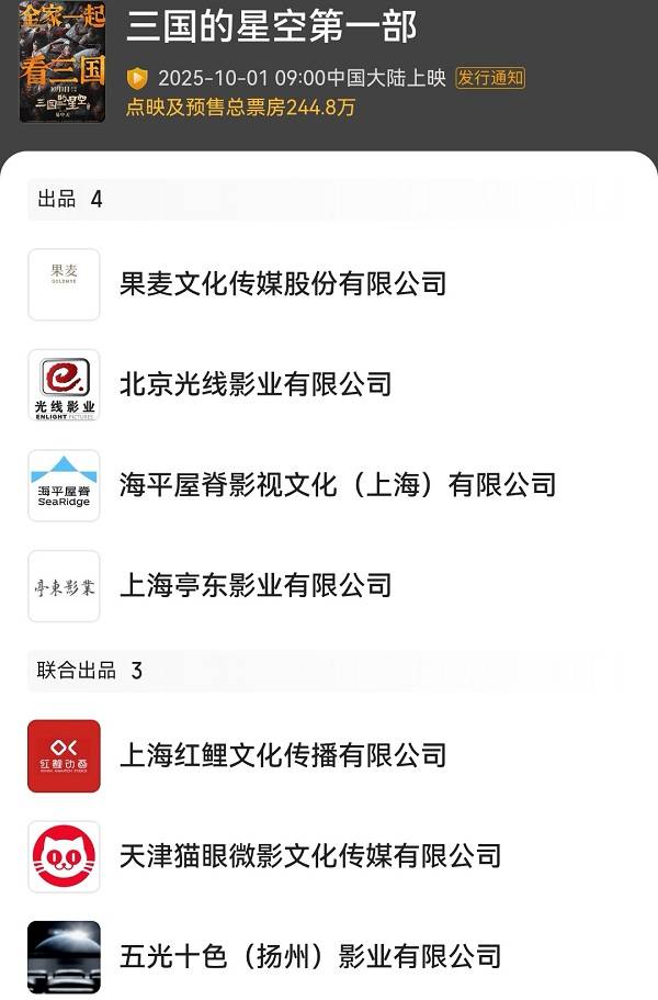 上海亭东影业还参投了由路金波的果麦文化和光线影业出品的《三国的星空第一部》,这部动画电影亭东是第四大出品方,果麦、光线是前两大出品方,光线负责发行。