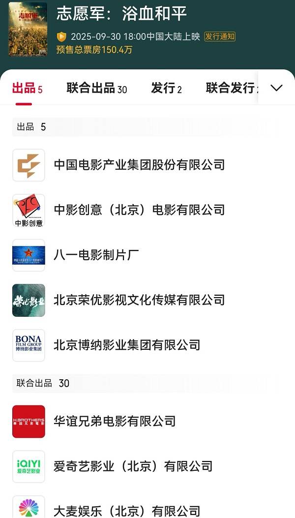 《志愿军3》是中影主控的项目,其他主要出品方还包括八一电影制片厂、博纳影业、华谊兄弟、爱奇艺影业、大麦娱乐、万达影视、长影集团、英皇、寰亚、联瑞、上海儒意、横店影业、猫眼微影、华文映像、登峰国际(吴京公司)等,都是业内主流公司。