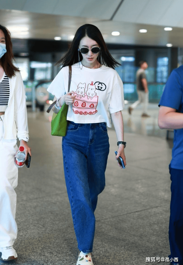 李小冉的这套机场穿搭,是童趣与高级感的巧妙融合。白色短款卡通T恤印有猫咪图案,特别减龄,搭配的蓝色高腰阔腿牛仔裤也很随性经典,宽松版型平衡了T恤的俏皮,兼具复古和休闲,时尚感拉满。