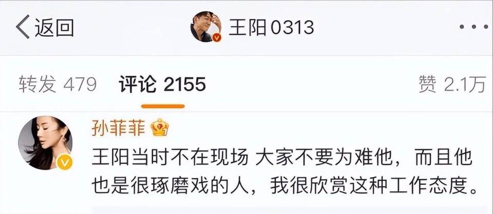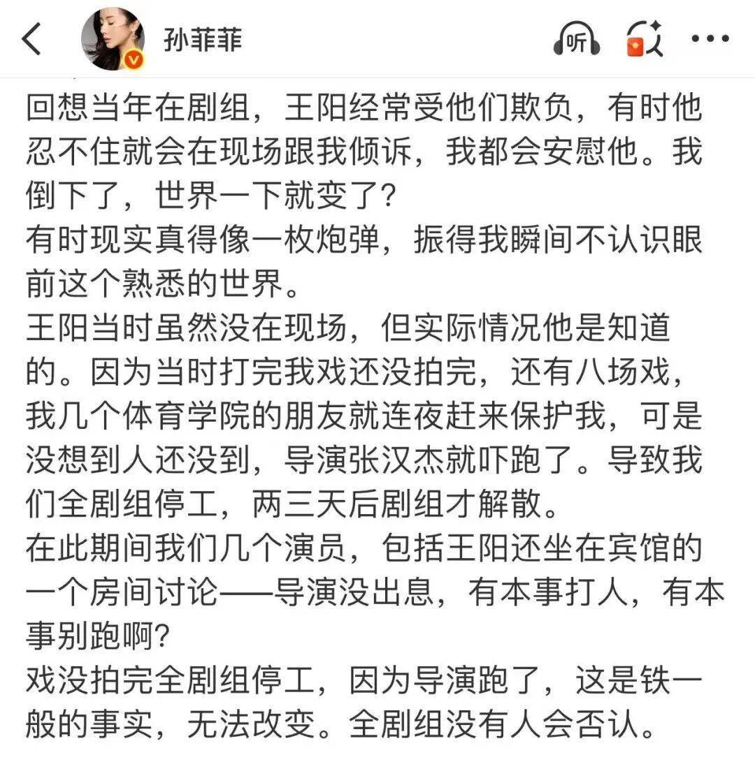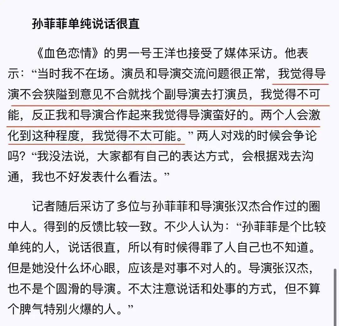 在孙菲菲澄清之后,朋友发给了她当年王阳的言论。她这才发现,在自己四面楚歌的时候,王阳曾在采访中说:跟导演合作起来蛮好的,打人这件事不可能。