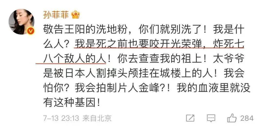 被王阳粉丝激怒时,孙菲菲曾说出这句话:我是死之前也要咬开光荣弹,炸死七八个敌人的人。这个玉石俱焚的描述可称惨烈。
