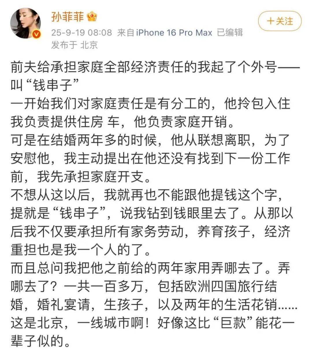 只是气不平,孙菲菲在微博上历数前夫种种奇葩往事,什么以奇怪的眼神瞪视伴郎啊,怀孕三个月没买过一粒葡萄干啊,他家人认为他收入比普京高啊,他诬赖她害死他父亲啊……各种离谱剧情。