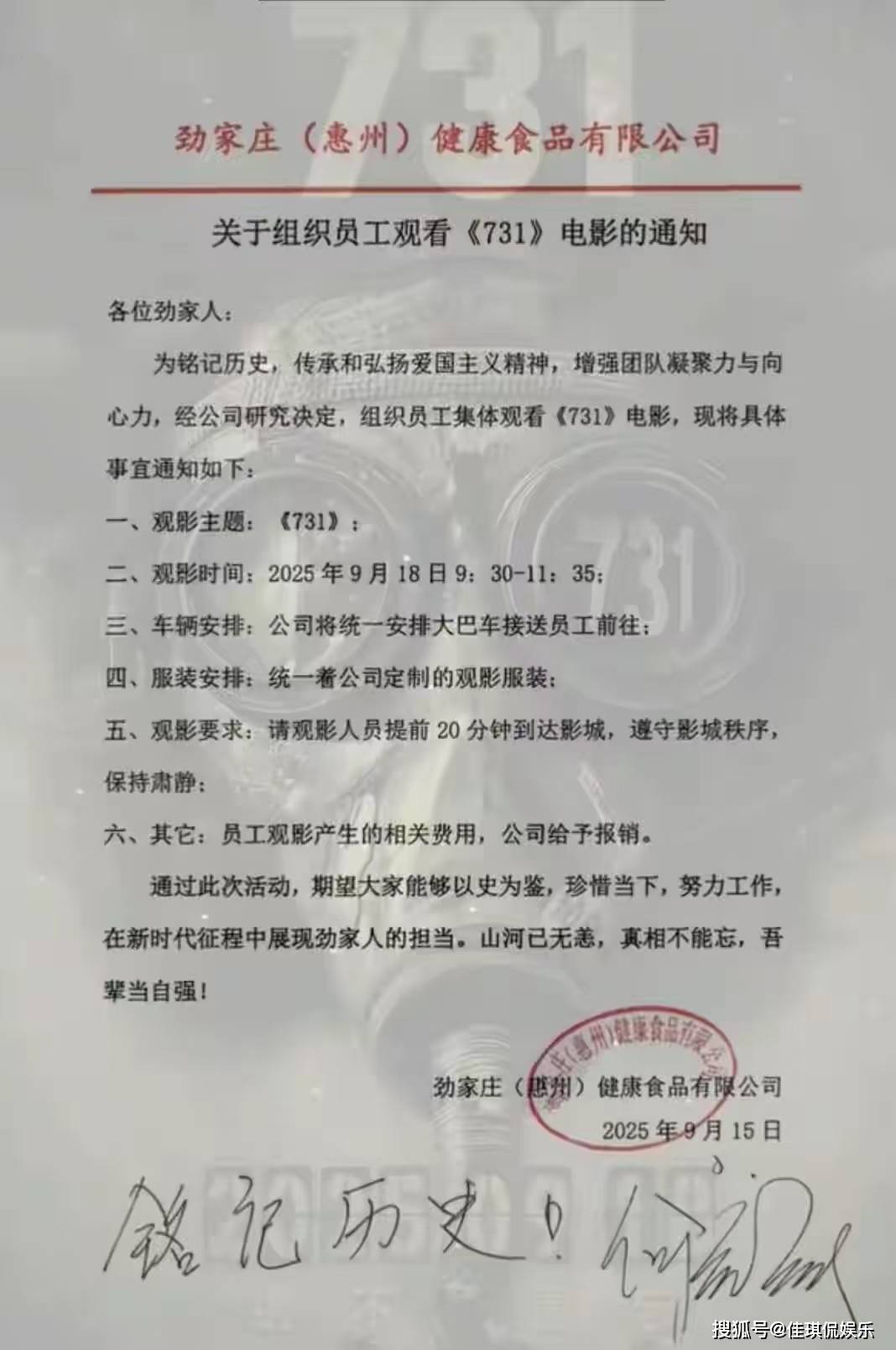 他提前好几天就给自家劲家庄的员工发通知,说9月18号上午不上班,全员去看《731》,还特意在通知上亲笔写了“铭记历史”四个字。